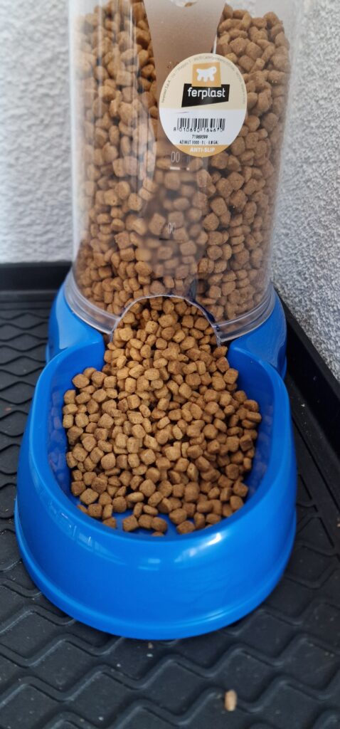 Da fand ich einen günstigen Futter / Wasserspender und der funktionierte nicht. Das Loch war sehr tief geschnitten (muss, sonst würde das Wasser ja auslaufen) und hemmte so den Trockenfutterfluss derart, dass der Napf für Katzenverhältnisse leer blieb.