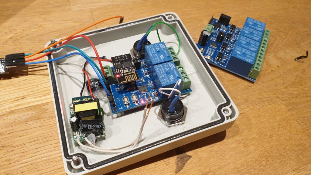 To be able to open both garage doors via OpenHAB, I use a 2-relay board with an ESP01 on it.